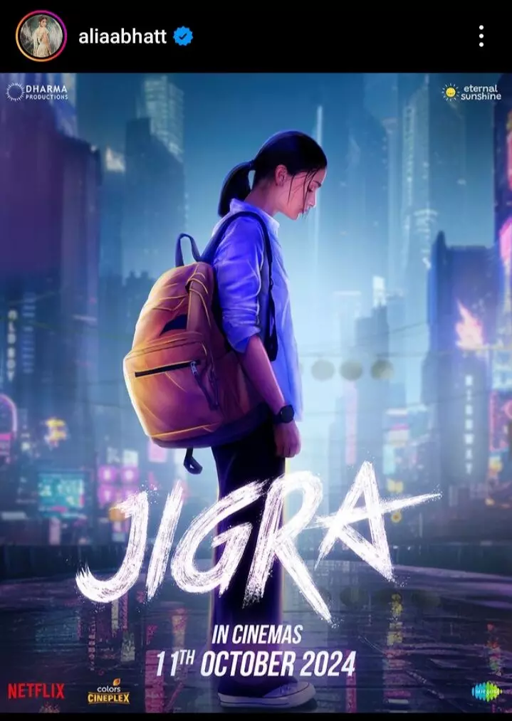 बॉलीवुड एक्ट्रेस आलिया भट्ट की अपकमिंग फिल्म जिगरा की रिलीज डेट भी आज सामने आई है। आलिया की नई फिल्म 'जिगरा 11 अक्टूबर 2024 को रिलीज होगी। इसे लेकर एक्ट्रेस ने सोशल मीडिया के इंस्टाग्राम अकाउंट से पोस्ट शेयर किया है। इससे पहले एक्ट्रेस इस फिल्म की छोटी सी झलक सामने आई थी जिसमें उनका लुक काफी अलग नजर आ रहा था।