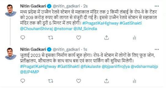 केंद्रीय गडकरी ने ट्वीट कर बताया कि 209 करोड़ रुपए की लागत से उज्जैन रेलवे स्टेशन से महाकाल मंदिर तक बनने वाले रोपवे से 5 मिनट में 2 किमी की दूरी तय की जाएगी। जुलाई 2023 से इसका निर्माण कार्य शुरू होगा। रोप-वे स्टेशन में लोगों के लिए फूड जोन, प्रतीक्षालय, शौचालय के साथ साथ बस एवं कार पार्किंग की सुविधा मिलेगी।