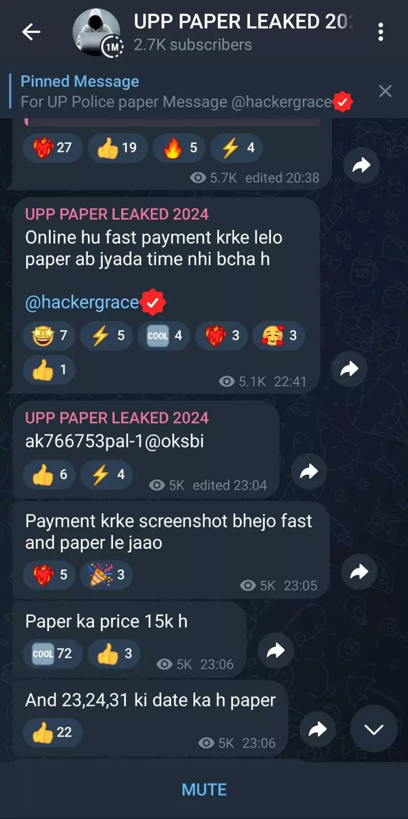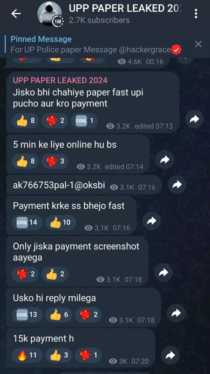 इन सभी के खिलाफ केस दर्ज किया गया है, पुलिस ने मामले को बेहद गंभीरता से लिया है, इसलिए कई टीमें तफ्तीश में लगाई गई हैं। इन चैनलों पर देर रात तक मेसेज आते रहे। इनमें लिखा था कि, जो पैसे देगा उसी रिप्लाई किया जाएगा। इसके अलावा पेपर होने पहले तक यूपीआई पेमेंट की बात की गई। एक मेसेज सुबह @upp paper leak 2024 पर डाला गया कि, जिसे भी पेपर चाहिए वह जल्दी से पेमेंट कर दे।