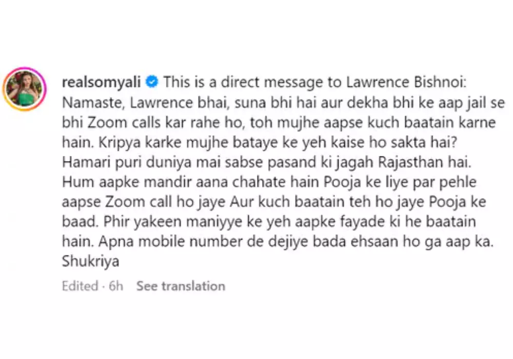 सोमी ने राजस्थान के बिश्नोई समाज के मंदिर जाकर पूजा करने की इच्छा भी जताई और लॉरेंस से उनका मोबाइल नंबर मांगा। उन्होंने लिखा, "राजस्थान मेरी सबसे पसंदीदा जगह है, और मैं वहां पूजा करने आना चाहती हूं। पहले आपसे कुछ बात हो जाए तो अच्छा होगा। यकीन मानिए, ये आपके फायदे की ही बात है।"