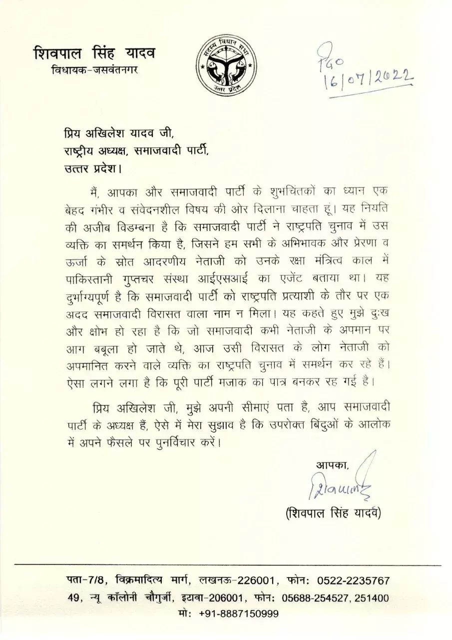शिवपाल सिंह ने आगे पत्र में कहा की जो समाजवादी पार्टी मुलायम सिंह यादव के बारे में एक शब्द सुनने को तैयार नहीं थी। वह आज उनके खिलाफ बयान देने वाले को राष्ट्रपति चुनाव का उम्मीदवार बना रही है।उन्होंने लिखा की मुझे अपनी सीमाएं पता है, फिर भी मैं पुनर्विचार की मांग करता हूँ।