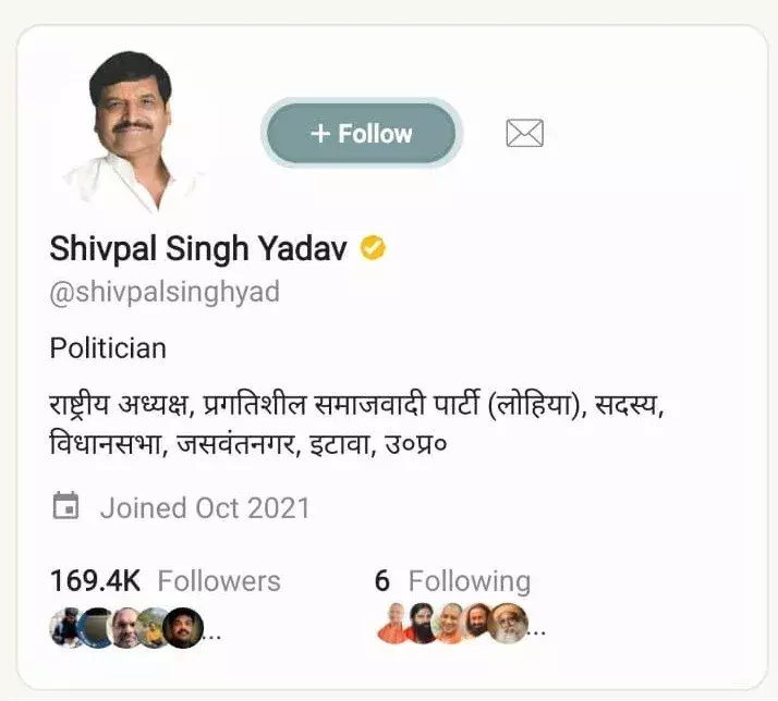 |लखनऊ। प्रगतिशील समाजवादी पार्टी के अध्यक्ष शिवपाल यादव ने अपने ट्वीटर हैंडल पर फालोइंग की संख्या बढ़ाकर 12 कर दी। शिवपाल यादव की फालोइंग की संख्या बढ़ने पर राजनीतिक गलियारे में चर्चा तेज हो गयी कि उन्होंने प्रधानमंत्री नरेन्द्र मोदी, मुख्यमंत्री योगी आदित्यनाथ को ट्वीटर पर फॉलो किया।