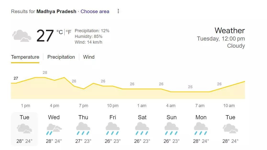 गुना, शिवपुरी, दमोह, टीकमगढ़, सिवनी, डिंडोरी, छिंदवाड़ा, मंडला, बालाघाट, विदिशा, रीवा, सागर, शहडोल सीहोर, रायसेन, भोपाल, उज्जैन, जबलपुर,और नर्मदापुरम जिलों में भारी बारिश देखने को मिल सकती है। जबकि, इंदौर, ग्वालियर और बाकी जिलों में हल्की से मध्यम बारिश हो सकती है। उज्जैन, ग्वालियर और जबलपुर भोपाल, इंदौर, जैसे प्रमुख शहरों में हल्की बारिश और बौछारें पड़ने की संभावना है।