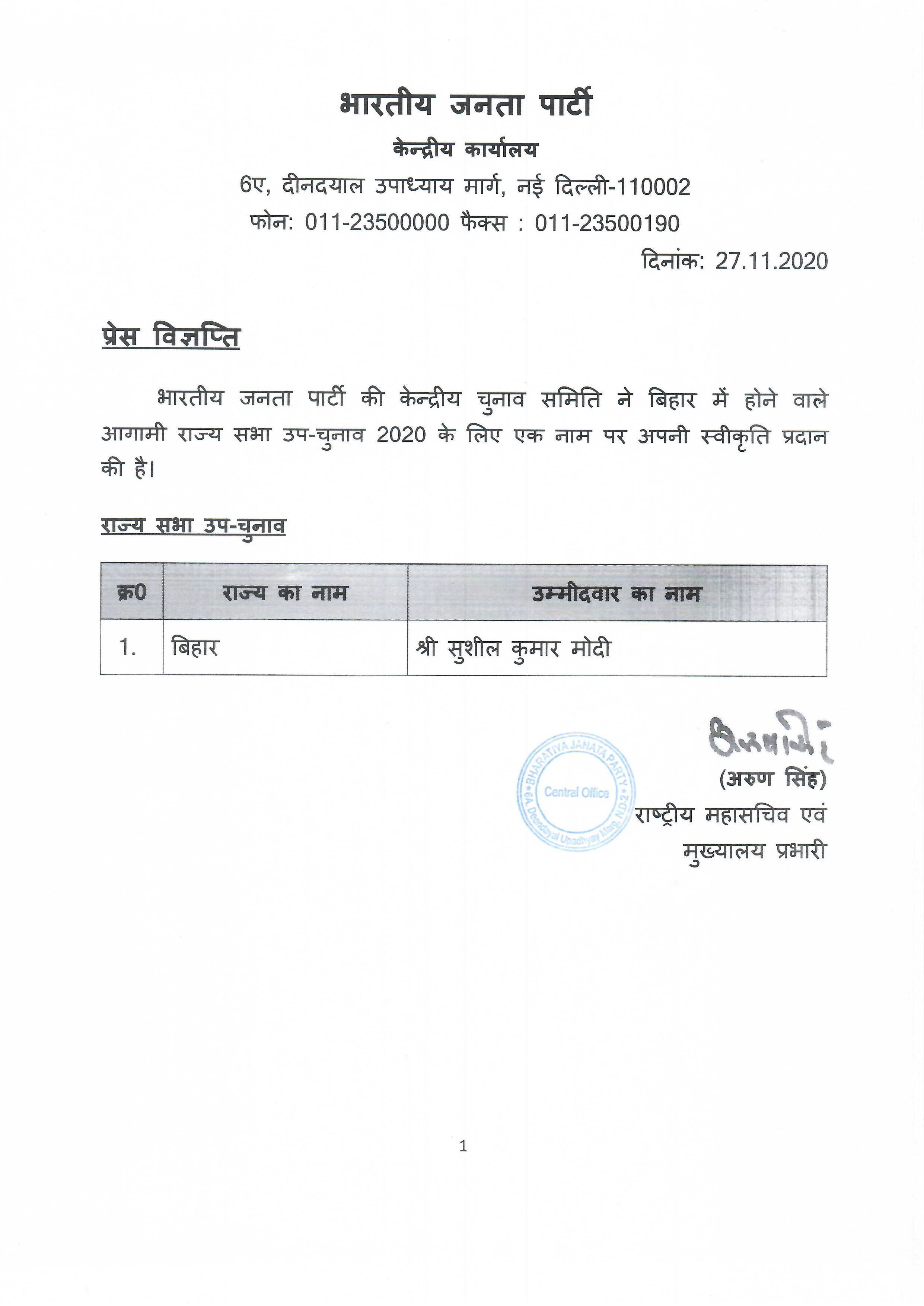 गौरतलब है कि रामविलास पासवान को भाजपा ने अपने कोटे से राज्यसभा में भेजा था। लेकिन उनके निधन के बाद यह सीट खाली हो गयी।