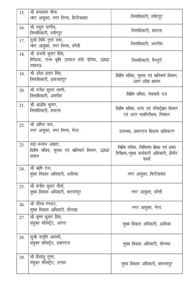 |UP IAS Transfer : उत्तरप्रदेश। योगी आदित्यनाथ की सरकार ने देर रात बड़ी प्रशासनिक सर्जरी की है। उत्तरप्रदेश में 29 अधिकारियों के तबादले कर दिए गए हैं। योगी आदित्यनाथ की सरकार ने 13 जिलों के डीएम बदल दिए हैं। तबादल सूची के अनुसार रविंद्र कुमार मंदन को प्रयागराज की कमान सौंपी गई है। इसी तरह फतेहपुर, आगरा, शाहजहांपुर, जौनपुर, शामली, हाथरस, हमीरपुर, अमरोहा और मैनपुरी के जिलाधिकारी भी बदले गए हैं।