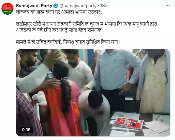 |BJP MLA Manju Tyagi Nomination Controversy : स्वदेश डेस्क। लखीमपुर में गुरुवार को फूड़बेहड़ सहकारी समिति के नामांकन में बवाल हो गया।किया। पुलिस ने उन्हें समझाने की कोशिश की तो नोंक-झोंक शुरू हो गई। पुलिस और सपाइयों के बीच जोर आजमाइश और धक्का-मुक्की होने लगी। पुलिस ने लाठी लगाकर प्रदर्शनकारियों को आगे की तरफ बढ़ने से रोका। तभी सपा कार्यकर्ता पुलिस को धकेलने लगे। पुलिस ने लाठीचार्ज कर दिया। पूर्व विधायक रामसरन समेत अन्य सपा कार्यकर्ताओं को दौड़ा-दौड़ाकर मारा पीटा। समाजवादी पार्टी के अध्यक्ष अखिलेश यादव ने कहा- यूपी में गुंडई चल रही है। अब बुलडोजर किस बिल में घुस गया।