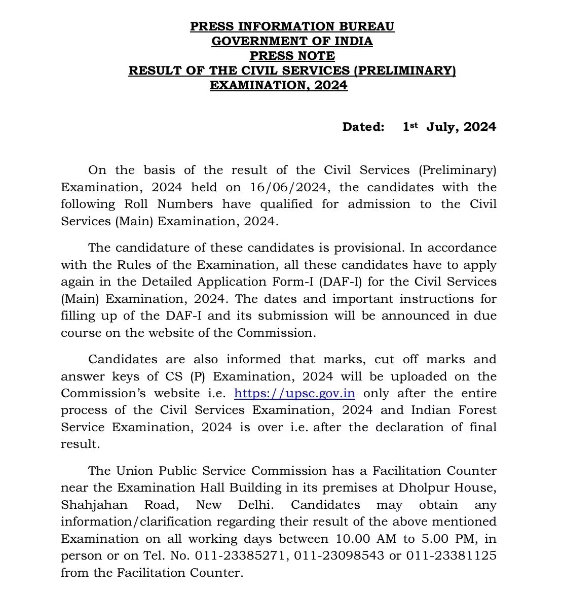 UPSC Prelims Result 2024 :संघ लोक सेवा आयोग यानी यूपीएससी की प्रारंभिक परीक्षा 2024 का परिणाम हाल ही में आधिकारिक वेबसाइट पर जारी कर दिया है जहां छात्र परीक्षा के बाद परिणाम का इंतजार कर रहे थे। बता दें, यूपीएससी सीएसई प्रारंभिक परीक्षा 16 जून 2024 को देश भर में विभिन्न परीक्षा केंद्रों पर आयोजित की गई थी।