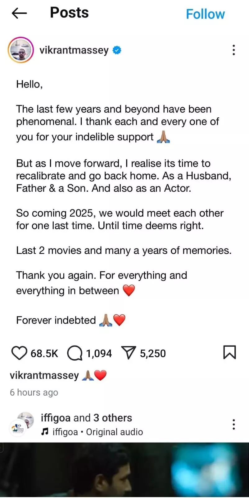 इंस्टाग्राम पर शेयर किए गए एक पोस्ट में विक्रांत मैसी ने लिखा, "पिछले कुछ साल और उससे पहले का समय अद्भुत रहा है। मैं आप सभी का धन्यवाद करता हूं, जिन्होंने मुझे हमेशा समर्थन दिया, लेकिन जैसे ही मैं आगे बढ़ा तो मुझे यह एहसास हुआ कि एक पति, पिता, बेटे और एक अभिनेता के रूप में भी अब खुद को पुनः संरेखित करने और घर लौटने का समय आ गया है।"