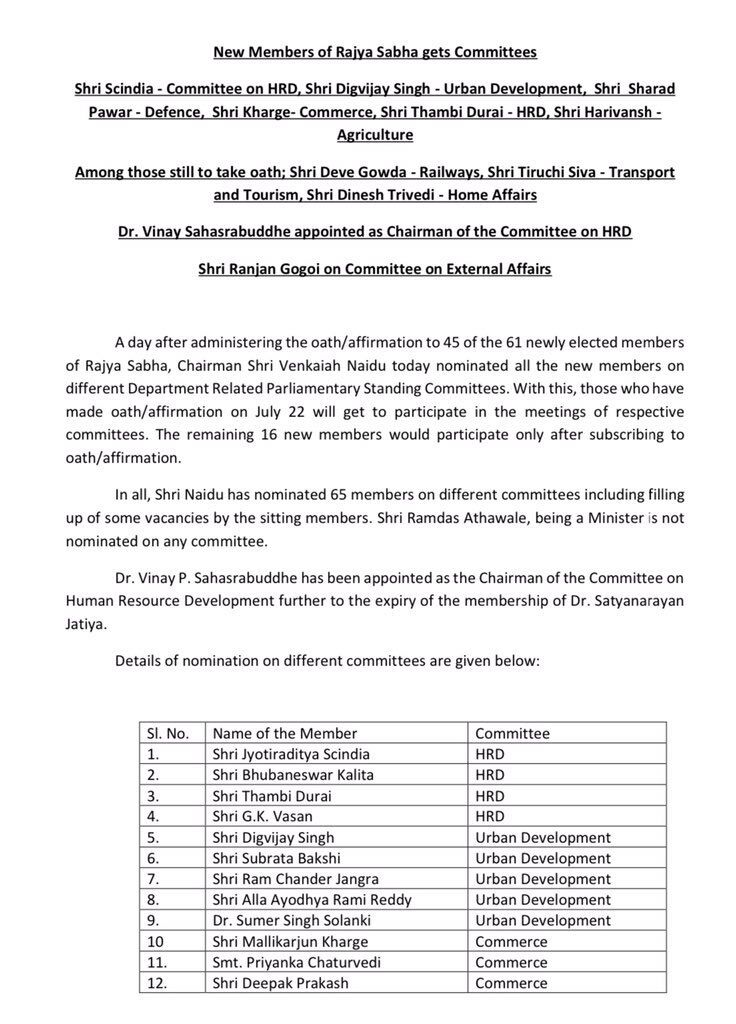 नईदिल्ली/वेब डेस्क। राज्यसभा के लिए 61 नए सांसद निर्वाचित हुए हैं। 22 जुलाई को शपथ लेने के बाद लगभग 45 सांसदों को उपराष्ट्रपति एवं राज्यसभा सभापति वेंकैया नायडू ने राज्यसभा की पार्लियामेंटरी स्टैंडिंग कमेटी में जिम्मेदारी दी है। HRD (मानव संसाधन विकास मंत्रालय) से जुड़ी समिति में राज्यसभा सांसद विनय सहस्रबुद्धे को अध्यक्ष एवं निर्वाचित सांसद ज्योतिरादित्य सिंधिया को सदस्य नियुक्त किया है।