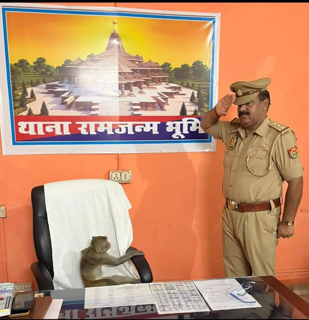 दरअसल, स्वतंत्रता दिवस पर थाना राम जन्मभूमि में थाना प्रभारी की कुर्सी पर बंदर आकार बैठ गया। लोग इन्हें बजरंगबली का स्वरुप बता रहे हैं। प्रभारी निरीक्षक देवेंद्र पाण्डेय ने जैसे ही अपनी कुर्सी पर बन्दर को बैठे देखा उन्होंने सलामी देकर कहा “जय हिंद सर”। देवेंद्र पाण्डेय का कहना है कि, अयोध्या धाम के कोतवाल है बजरंगबली और वही अयोध्या की सुरक्षा करते है।