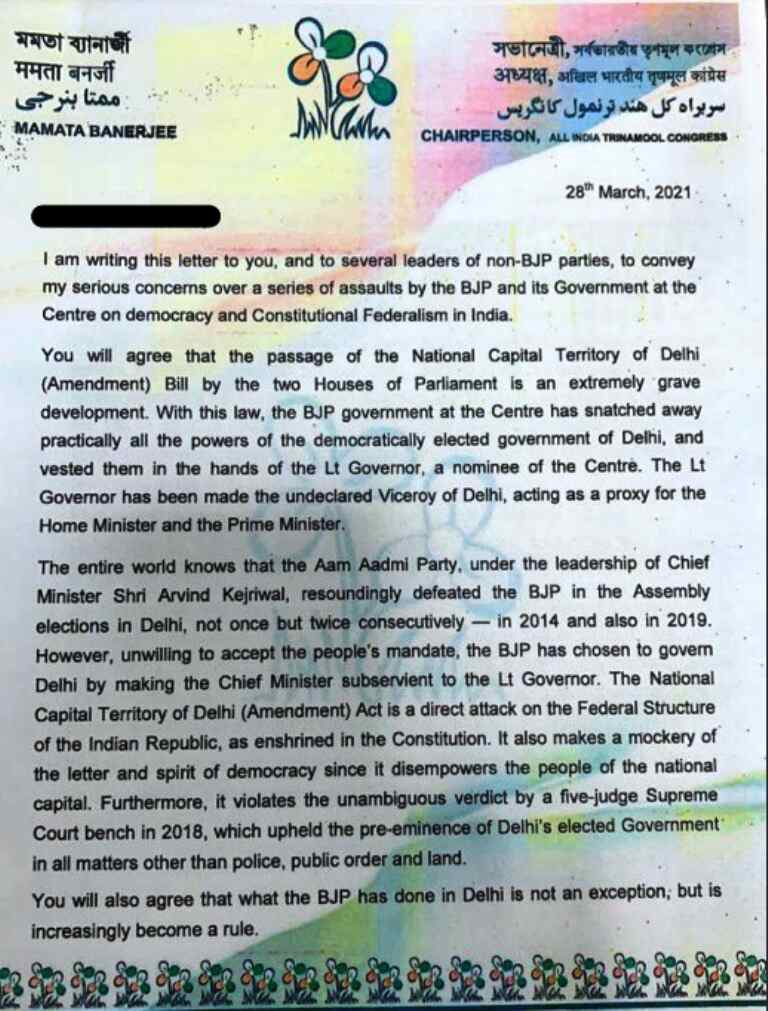 पत्र में ममता बनर्जी ने कहा है कि भारतीय जनता पार्टी पूरे देश में एकनायकवाद लागू करना चाहती है औरजोकि देश की लोकतांत्रिक व्यवस्था के लिए सबसे खतरनाक पहलू है। पत्र में ममता ने दावा किया है कि भारतीय जनता पार्टी के शासन के दौरान अलग-अलग राज्यों में विपक्षी पार्टियों की सरकारों के साथ केंद्र के जितने बुरे रिश्ते रहे हैं, उतने भारत के इतिहास में पहले कभी नहीं रहे। उन्होंने पत्र में लिखा है कि भारतीय जनता पार्टी सीबीआई, ईडी, आयकर विभाग जैसी केंद्रीय एजेंसियों के जरिए विपक्षी नेताओं को डरा धमका कर उन्हें परेशान कर रही है। विपक्षी पार्टियों के अधिकारों को पूरी तरह से खत्म करने की कोशिश की जा रही है और यह सब प्रधानमंत्री नरेंद्र मोदी के नेतृत्व में कुछ हो रहा है।