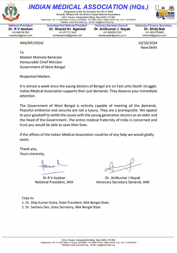 जूनियर डॉक्टरों की चल रही भूख हड़ताल के बारे में पश्चिम बंगाल की मुख्यमंत्री ममता बनर्जी को पत्र लिखते हुए इंडियन मेडिकल एसोसिएशन ने कहा है कि, "बंगाल के युवा डॉक्टरों को आमरण अनशन करते हुए लगभग एक सप्ताह हो गया है। इंडियन मेडिकल एसोसिएशन उनकी जायज मांगों का समर्थन करता है। वे आपके तत्काल ध्यान के हकदार हैं। पश्चिम बंगाल सरकार सभी मांगों को पूरा करने में पूरी तरह सक्षम है। शांतिपूर्ण माहौल और सुरक्षा कोई विलासिता नहीं है। वे एक शर्त हैं। हम आपसे एक बुजुर्ग और सरकार के मुखिया के रूप में युवा पीढ़ी के डॉक्टरों के साथ मुद्दों को सुलझाने की अपील करते हैं। भारत का पूरा चिकित्सा समुदाय चिंतित है और भरोसा करता है कि आप उनकी जान बचा पाएंगे। अगर इंडियन मेडिकल एसोसिएशन के कार्यालय किसी भी तरह से मदद कर सकते हैं तो हम खुशी से मदद करेंगे।"