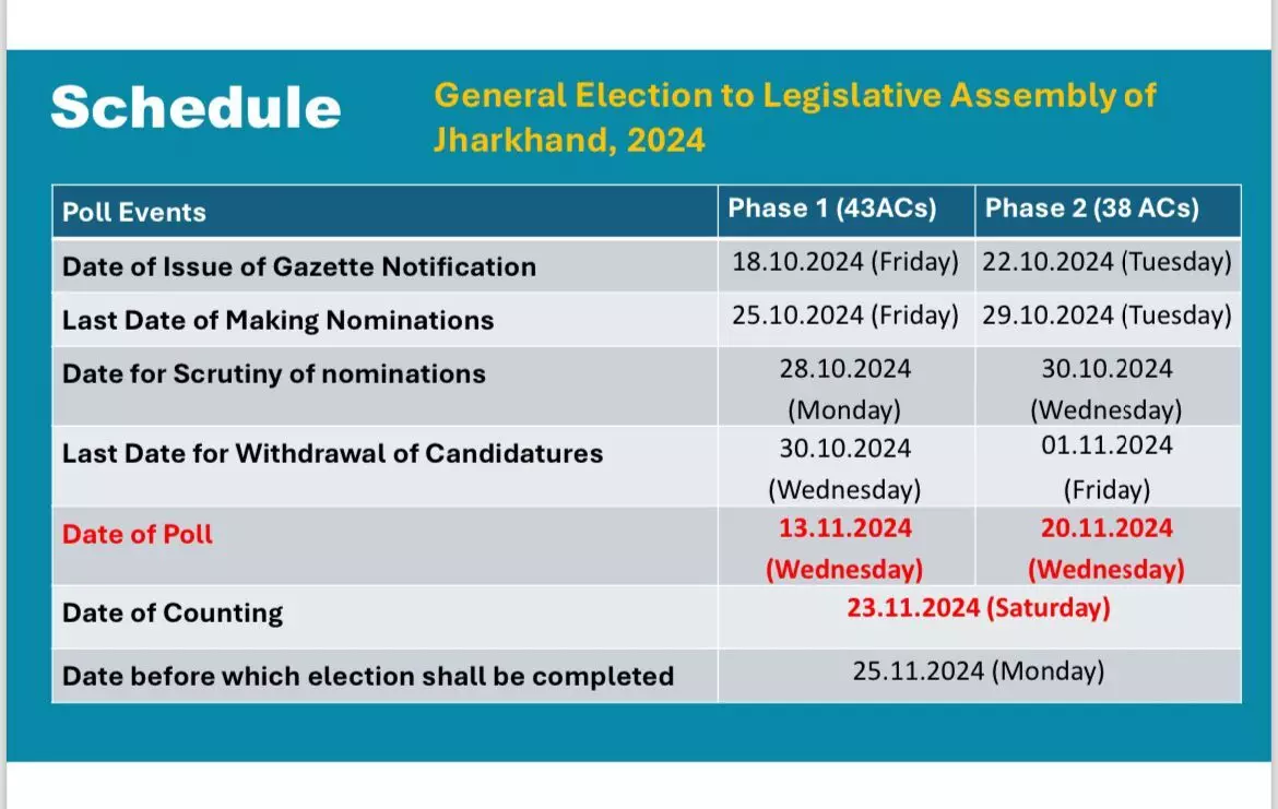 |Jharkhand Assembly Elections Date: नई दिल्ली। भारत निर्वाचन आयोग द्वारा मंगलवार को पीसी बुलाकर महाराष्ट्र और झारखंड में विधानसभा चुनाव की तारीख का ऐलान किया गया। सीईसी ने बताया कि, महाराष्ट्र में एक चरण और झारखंड में दो चरण में चुनाव होगा। झारखंड में विधानसभा की 81 सीट पर मतदान होना है। पहले चरण में 43 विधानसभा सीट और दूसरे चरण में 38 विधानसभा सीट पर मतदान होगा।