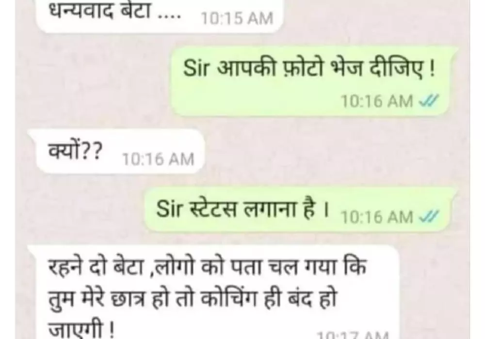अब आते हैं उस मजेदार चैट पर, जो इन दिनों सोशल मीडिया पर छाई हुई है। इसमें एक छात्र और शिक्षक के बीच की बातचीत ने सबको खूब हंसाया। छात्र शिक्षक को शिक्षक दिवस की शुभकामनाएं देता है और उनसे एक फोटो मांगता है। जब शिक्षक उससे फोटो का कारण पूछते हैं, तो वह मासूमियत से कहता है कि उसे अपने स्टेटस में लगानी है। इस पर शिक्षक मजेदार जवाब देते हुए कहते हैं, "रहने दो बेटा, अगर लोगों को पता चल गया कि तुम मेरे स्टूडेंट हो, तो कोचिंग ही बंद हो जाएगी।" इस पर छात्र जल्दी से "OK" लिखकर जवाब देता है