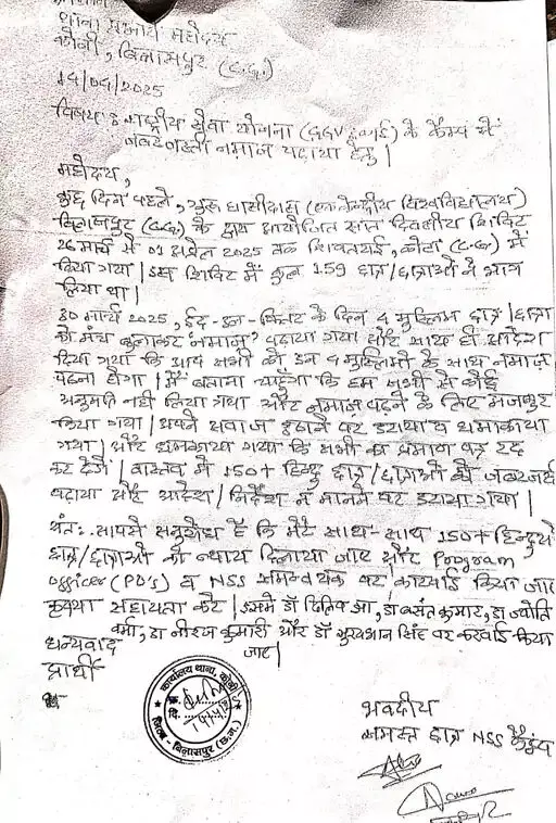 Bilaspur GGU Hindu Students Namaz Controversy : छत्तीसगढ़। बिलासपुर की गुरु घासीदास सेंट्रल यूनिवर्सिटी में 155 हिन्दू छात्रों को जबरदस्ती नमाज पढ़ाने वाले NSS कोआर्डिनेटर को पद से हटा दिया है। यह फैसला कुलपति प्रो. आलोक चक्रवाल ने NSS कैंप के दौरान ईद पर नमाज पढ़ाने का मामला सामने आने के बाद लिया है। इसी मामले को लेकर हिन्दू संगठन और ABVP आज यूनिवर्सिटी परिसर का घेराव करेंगे।