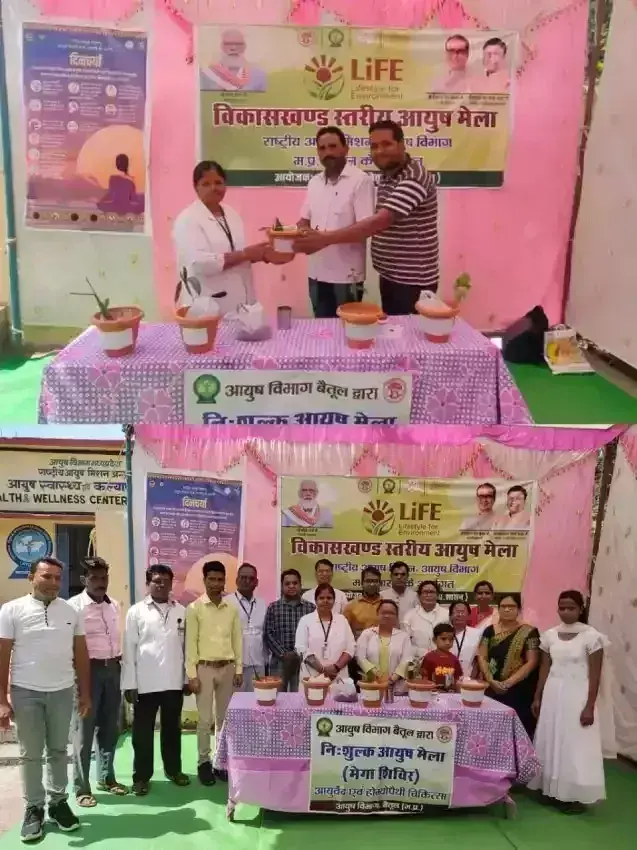 आमला/वेब डेस्क। भारत सरकार एवं म. प्र. शासन आयुष विभाग द्वारा विकासखंड आमला के ग्राम खेड़लीबाजार में आयुष स्वास्थ्य एवं कल्याण केन्द्र परिसर में विकासखंडस्तरीय आयुष मेले का आयोजन किया गया। कार्यक्रम में अतिथि के रूप में अतुल पारखे सरपंच, योगेश रघुवंशी पूर्व सरपंच, सचिन बिहारिया, दिगंबर बारस्कर, ओम प्रकाश नायक सहित अन्य गणमान्य नागरिक उपस्थित रहे। अतिथियों द्वारा भगवान धन्वंतरि का पूजन अर्चन कर कार्यक्रम का शुभारंभ किया गया।