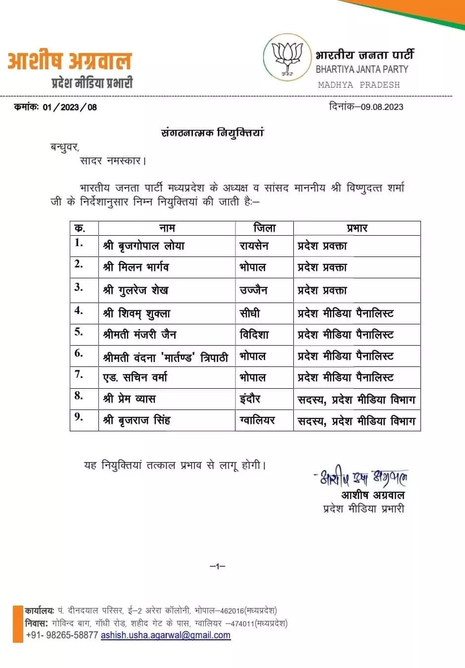 इस संबंध में जारी किए गये आदेश के अनुसार बृजगोपाल लोया -रायसेन, मिलन भार्गव- भोपाल एवं गुलरेज शेख- उज्जैन को प्रदेश प्रवक्ता नियुक्त किया है। शिवम शुक्ला- सीधी, मंजरी जैन- विदिशा, वंदना ‘मार्तण्ड’ त्रिपाठी- भोपाल, एडव्होकेट सचिन वर्मा- भोपाल को प्रदेश मीडिया पैनलिस्ट नियुक्त किया गया है। इसी तरह प्रेम व्यास- इंदौर एवं बृजराज सिंह- ग्वालियर को प्रदेश मीडिया विभाग का सदस्य नियुक्त किया है।
