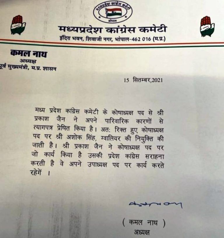 अशोक सिंह बने मप्र कांग्रेस के कोषाध्यक्ष, प्रकाश जैन ने दिया इस्तीफा