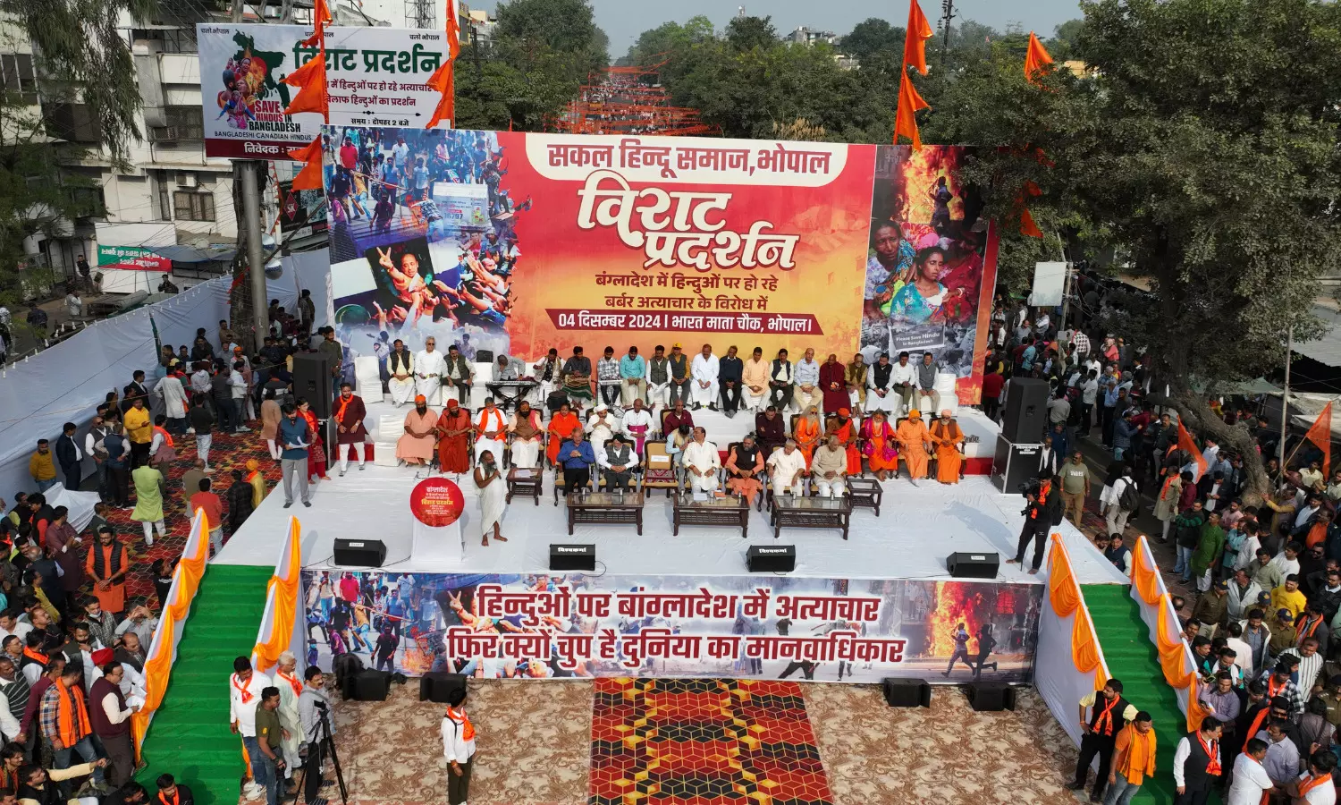 बांग्लादेश में हिन्दुओं पर हो रहे अत्याचार के खिलाफ बुधवार को भारत माता चौक, भोपाल में विराट प्रदर्शन किया गया। बांग्लादेश में हिन्दुओं पर हो रहे अत्याचार के खिलाफ सकल हिन्दू समाज भोपाल द्वारा विराट प्रदर्शन का आयोजन किया गया जिसमें बड़ी में हिन्दू समाज के लोग एवं संत उपस्थित रहे। दोपहर 2 बजे से शुरू हुए इस विशाल प्रदर्शन में हजारों की संख्या में लोग उपस्थित रहे।