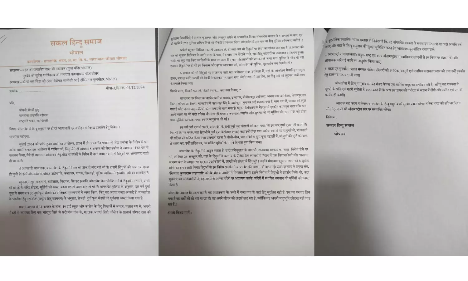 सकल हिन्दू समाज ने अपने ञापन में यह मांग रखी कि बांग्लादेश सरकार से वहां हिन्दुओं पर अत्याचार तत्काल बंद करना सुनिश्चित कराया जाए एवं जेल में बंद इस्कॉन के संत चिन्मय कृष्ण दास को अविलंब कारावास से मुक्त करे। इसके साथ हीं भारत सरकार से आह्वान किया कि बांग्लादेश में हिन्दुओं और बाकी अल्पसंख्यकों पर अत्याचार रोकने के मजबूती से प्रयास करे और इसके समर्थन में वैश्विक अभिमत बनाने के यथाशीघ्र कदम उठाए।