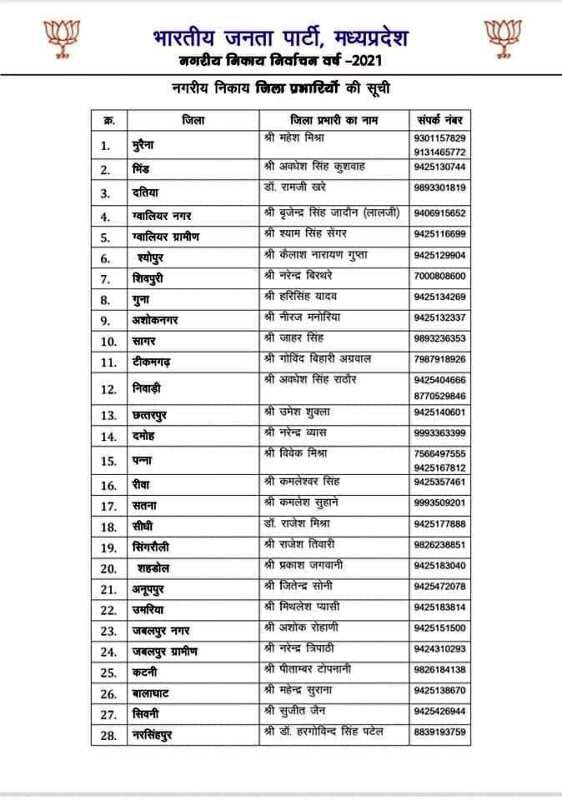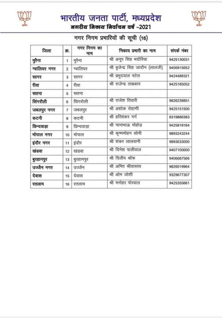 नगर निगम चुनाव प्रभारियों हेतु श्री अनूप सिंह भदौरिया मुरैना, श्री बृजेन्द्र सिंह जादौन (लालजी) ग्वालियर, प्रभुदयाल पटेल सागर, राजेन्द्र ताम्रकार रीवा, अरूण द्विवेदी सतना, राजेश तिवारी सिंगरौली, अशोक रोहाणी जबलपुर, हरिशंकर गर्ग कटनी, श्री नानाभाऊ मोहोड छिंदवाडा, श्री कृष्णमोहन सोनी भोपाल, श्री शंकर लालवानी इंदौर, श्री दिनेश पालीवाल खण्डवा, श्री दिलीप श्राफ बुरहानपुर, अमित श्रीवास्तव उज्जैन, ओम सोनी देवास एवं मनोहर पोरवाल रतलाम को मनोनीत किया गया है।