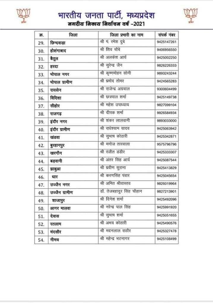 जिला चुनाव प्रभारियों हेतु महेश मिश्रा मुरैना, अवधेश सिंह कुशवाह भिण्ड, डॉ. रामजी खरे दतिया,बृजेन्द्र सिंह जादौन (लालजी) ग्वालियर नगर, श्याम सिंह सेंगर ग्वालियर ग्रामीण, कैलाश नारायण गुप्ता श्योपुर, नरेन्द्र बिरथरे शिवपुरी, हरिसिंह यादव गुना, नीरज मनोरिया अशोकनगर, जाहर सिंह सागर, गोविन्द बिहारी अग्रवाल टीकमगढ़, अवधेश सिंह राठौर निवाड़ी, उमेश शुक्ला छतरपुर, नरेन्द्र व्यास दमोह, विवेक मिश्रा पन्ना, कमलेश्वर सिंह रीवा, कमलेश सुहाने सतना, डॉ. राजेश मिश्रा सीधी, राजेश तिवारी सिंगरौली, प्रकाश जगवानी शहडोल, जितेन्द्र सोनी अनूपपुर, मिथलेश प्यासी उमरिया अशोक रोहाणी जबलपुर नगर, नरेन्द्र त्रिपाठी जबलपुर ग्रामीण, पीतांबर टोपनानी कटनी, महेन्द्र सुराना बालाघाट, सुजीत जैन सिवनी, डॉ. हरगोविन्द सिंह पटेल नरसिंहपुर, पं. रमेश दुबे छिंदवाडा, शिव चौबे होशंगाबाद, अलकेश आर्य बैतूल, सुरेन्द्र जैन हरदा, कृष्णमोहन सोनी भोपाल नगर, प्रमोद तोमर भोपाल ग्रामीण, राजेन्द्र अग्रवाल रायसेन, छत्रपाल शर्मा विदिशा, महेश उपाध्याय सीहोर, दीपक शर्मा राजगढ, शंकर लालवानी इंदौर नगर, राधेश्याम यादव इंदौर ग्रामीण, श्री सुभाष कोठारी ण्डवा, श्री मनोज तारवाला बुरहानपुर, रंजीत डंडीर खरगौन, श्री अंतरसिंह आर्य बडवानी, प्रवीण सुराना झाबुआ, करण सिंह पंवार धार, अमित श्रीवास्तव उज्जैन नगर, डॉ. तेजबहादुर सिंह चौहान उज्जैन ग्रामीण, दिनेश शर्मा शाजापुर, नरेन्द्रपाल सिंह आगर मालवा, सुभाष शर्मा देवास, श्री अभय कोठारी रतलाम, मदनलाल राठौर मंदसौर एवं महेन्द्र भटनागर नीमच को मनोनीत किया गया है।