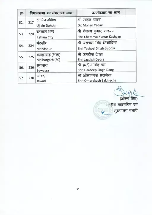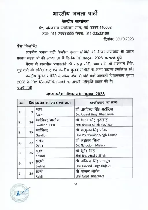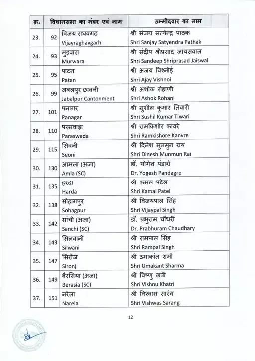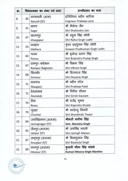 सूची के अनुसार भिंड जिले के अटेर से डॉ. अरविंद सिंह भदौरिया, ग्वालियर ग्रामीण से भारत सिंह कुशवाह, ग्वालियर से प्रद्युम्न सिंह तोमर, दतिया से डॉ. नरोत्तम मिश्रा, सागर जिले की खुरई विधानसभा से भूपेन्द्र सिंह, सुरखी से गोविन्द सिंह राजपूत, रेहली से गोपाल भार्गव, नरयावली से इंजीनियर प्रदीप लारिया, सागर से शैलेन्द्र जैन, छतरपुर जिले के खरगापुर से राहुल सिंह लोधी, बड़ा मलहरा से कुंवर प्रद्युम्न सिंह लोधी को भाजपा ने अपना उम्मीदवार बनाया है।