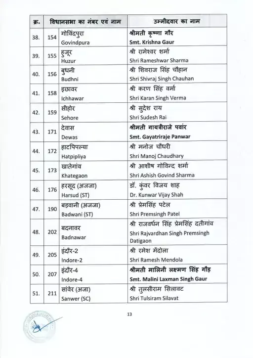 भोपाल जिले की बैरसिया विधानसभा से विष्णु खत्री, नरेला से विश्वास सारंग, गोविन्दपुरा से कृष्णा गौर, हुजूर से रामेश्वर शर्मा, सीहोर जिले की बुधनी विधानसभा से शिवराज सिंह चौहान, इछावर से करण सिंह वर्मा, सीहोर से सुदेश राय, देवास से गायत्रीराजे पंवार, हाटपिपल्या से मनोज चौधरी, खातेगांव से आशीष गोविन्द शर्मा, हरसूद से कुंवर विजय शाह, बड़वानी से प्रेम सिंह पटेल और बदनावर से राजवर्धन सिंह दत्तीगांव को टिकट दिया गया है।भाजपा ने इंदौर-2 विधानसभा से रमेश मेंदोला, इंदौर-4 से मालिनी लक्ष्मण सिंह गौड़, सांवेर से तुलसीराम सिलावट, उज्जैन दक्षिण से डा. मोहन यादव, रतलाम शहर से चेतन्य कुमार काश्यप, मंदसौर से यशपाल सिंह सिसोदिया, मल्हारगढ़ से जगदीश देवड़ा, सुवासरा से हरदीप सिंह डंग और जावद से ओमप्रकाश सखलेचा को उम्मीदवार बनाया है।