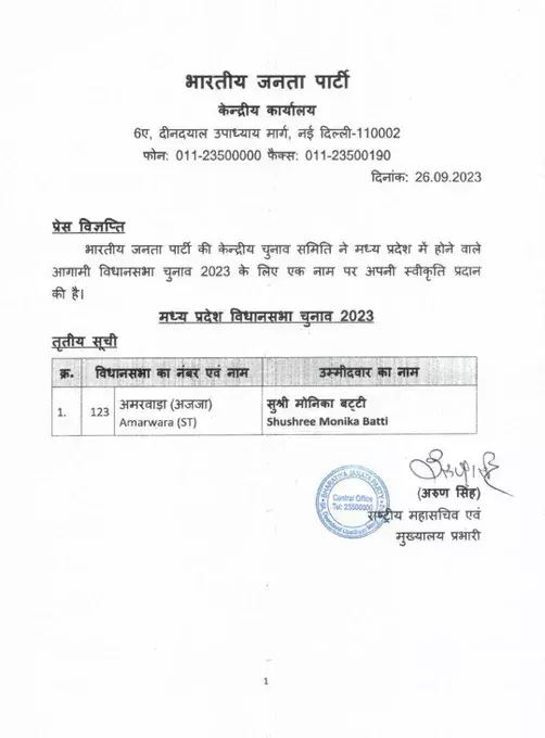 भोपाल। मप्र में इस साल के अंत में होने वाले विधानसभा चुनाव से पहले भाजपा ने आज एक सीट पर उम्मीदवार के नाम का ऐलान कर दिया है। भाजपा ने तीसरी लिस्ट में अमरवाड़ा से मोनिका बट्टी को टिकट दिया है। मोनिका हाल ही में कुछ दिन पहले भाजपा में शामिल हुई है। उन्हें मुख्यमंत्री शिवराज सिंह चौहान ने पार्टी की सदस्यता दिलाई है।
