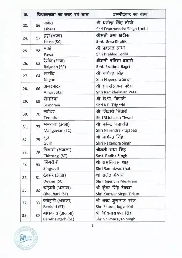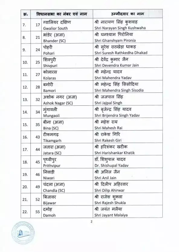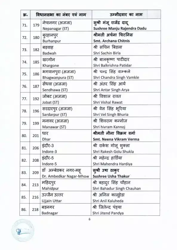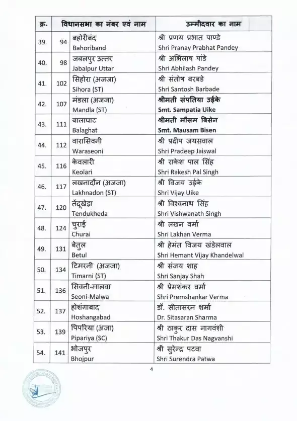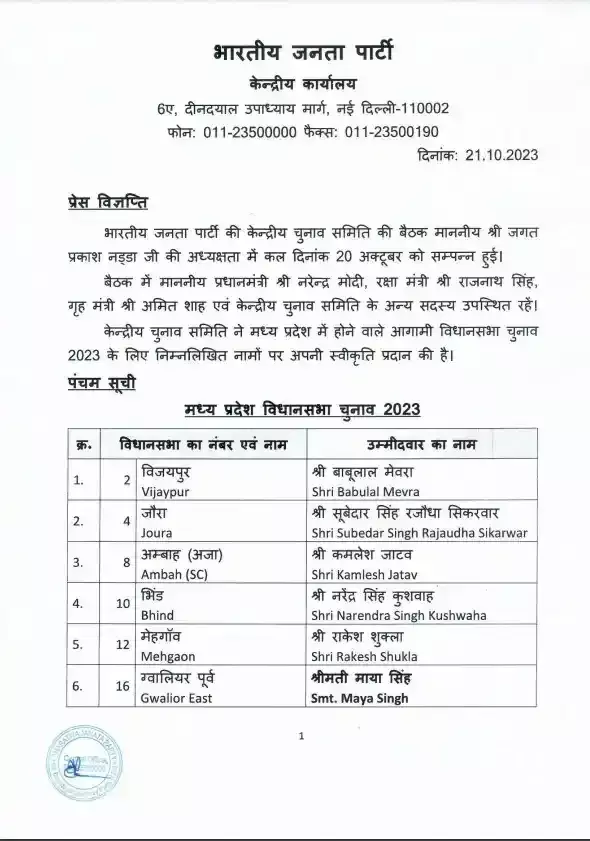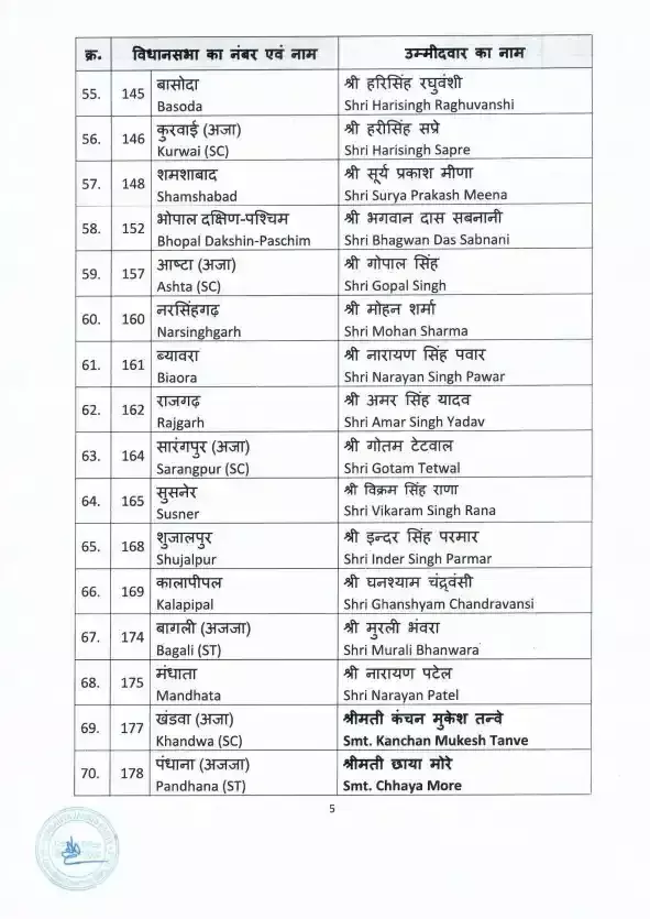 मप्र में भाजपा ने जारी की उम्मीदवारों की पांचवीं सूची