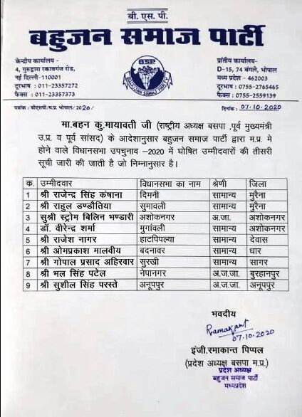राजेंद्र सिंह कंषाना को दिमनी, राहुल डंडोतिया को सुमावली, बिलिम भंडारी को अशोकनगर, वीरेंद्र शर्मा को मुंगावली, राजेश नागर को हाट पिपलिया, ओम प्रकाश मालवीय को बदनावर, गोपाल प्रसाद अहिरवार को सुरखी, भालसिंह पटेल को नेपानगर एवं सुशील सिंह परस्ते को अनूपपुर से टिकट मिला है। इससे पहले बसपा ने पहली सूची में 8 एवं दूसरी सूची में 10 सीटों पर उम्मीद्वारों के नाम की घोषणा की थी।