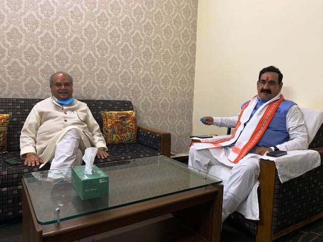 गृहमंत्री नरोत्तम मिश्रा से मिलने निवास पर पहुंचे केन्द्रीय मंत्री नरेन्द्र सिंह तोमर