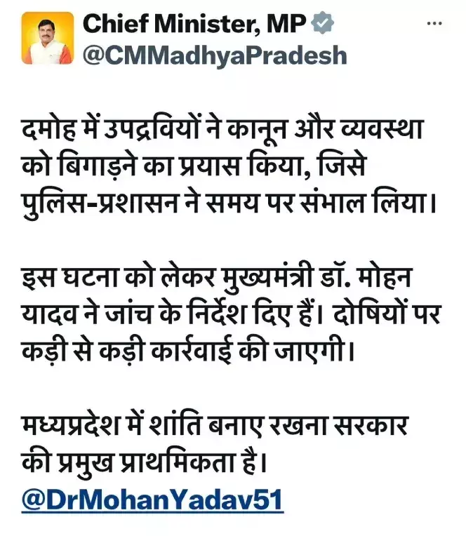 मुख्यमंत्री ने उन्होंने सोमवार को सोशल मीडिया प्लेटफार्म एक्स के माध्यम से कहा है कि मध्यप्रदेश में शांति और सौहार्द बनाए रखना सरकार की विशेष प्राथमिकता है। दमोह में कतिपय असामाजिक तत्वों ने कानून और व्यवस्था को बिगाड़ने का प्रयास किया, जिसे पुलिस प्रशासन ने बखूबी संभाल लिया। घटना की जांच के निर्देश दिए गए हैं। दोषियों पर कड़ी से कड़ी कार्रवाई की जाएगी।