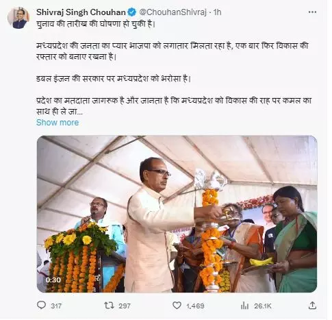 मुख्यमंत्री चौहान ने ट्वीट के माध्यम से कहा कि चुनाव की तारीख की घोषणा हो चुकी है। मध्यप्रदेश की जनता का प्यार भाजपा को लगातार मिलता रहा है, एक बार फिर विकास की रफ्तार को बनाए रखना है। डबल इंजन की सरकार पर मध्य प्रदेश को भरोसा है। प्रदेश का मतदाता जागरूक है और जानता है कि मध्य प्रदेश को विकास की राह पर कमल का साथ ही ले जा सकता है, तो इस बार की दिवाली कमल वाली।