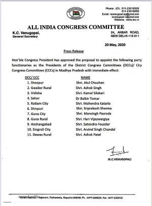 उपचुनावों की तैयारियां तेज, कांग्रेस ने की जिलाध्यक्षों की नियुक्ति