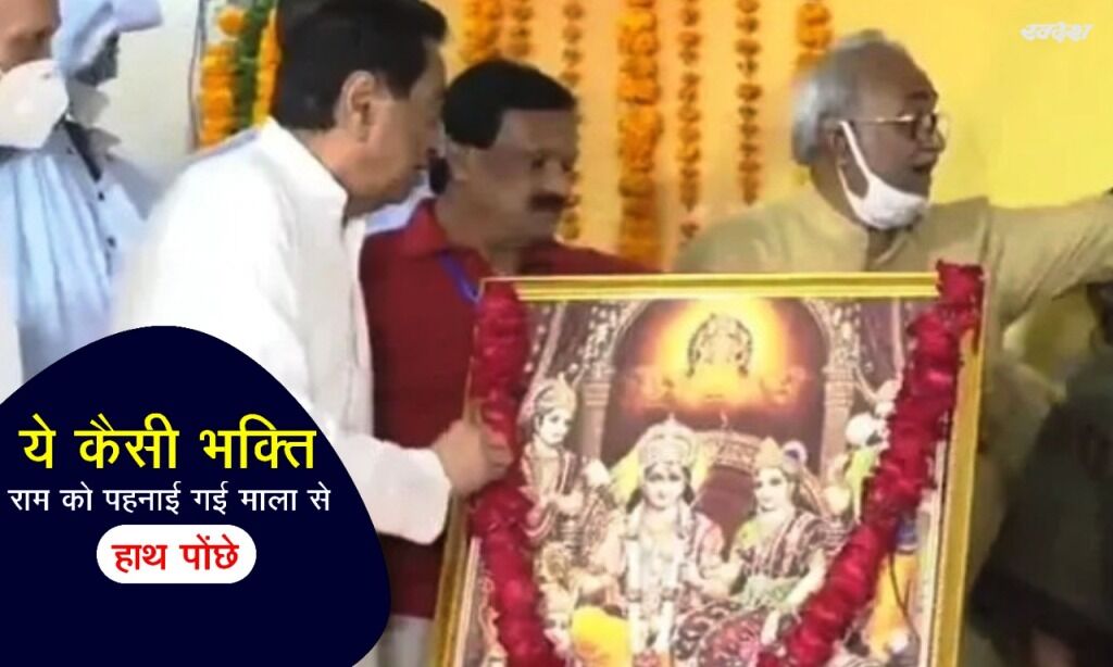 |भोपाल/वेब डेस्क। अयोध्या में राममंदिर भूमिपूजन के अवसर पर पूरे देश के साथ प्रदेश भर में 05 अगस्त को उत्साह दिखाई दिया। प्रदेश में आमजनों के साथ कांग्रेस पार्टी और पूर्व मुख्यमंत्री कमलनाथ ने इसे उत्सव की तरह मनाया। पूर्व सीएम कमलनाथ ने पीसीसी दफ्तर में भगवान श्रीराम की तस्वीर पर फूलों की माला चढ़ाई और दीप जलाये। उनके द्वारा की गई इस पूजा का एक वीडियो वायरल हो रहा है। जिसमें वह भगवान की माला से ही हाथ पोछते हुए नजर आ रहे है। कमलनाथ का यह वीडियो सोशल मीडिया पर जमकर ट्रोल हो रहा है।आमजन कमलनाथ के इस कृत्य को बेहद शर्मनाक बता रहे है।