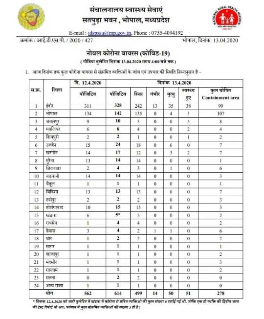 |भोपाल। प्रदेश में कोरोना संक्रमण के मामले लगातार बढ़ रहे है। शासन एवं प्रशासन द्वारा इसकी रोकथाम के लिये विभिन्न प्रयास किये जा रहे है लेकिन संक्रमितों की संख्या में लगातार इजाफा होता जा रहा है। प्रदेश के विभिन्न जिलों में आज नए मामले सामने आने के बाद मरीजों की संख्या बढ़कर 614 हो गई है। वहीँ प्रदेश में संक्रमण से मरने वालों की संख्या 50 हो गई है। जबकि 51 संक्रमित प्रदेश भर में स्वस्थ हुए है। मध्यप्रदेश स्वास्थ्य संचनालय द्वारा जारी रिपोर्ट के अनुसार पिछले 24 घंटों में प्रदेश में 52 नए मामले सामने आये है। जिसके बाद प्रदेश में जो आकड़ा कल शाम तक 562 था, वह आज बढ़कर 614 हो गया है।