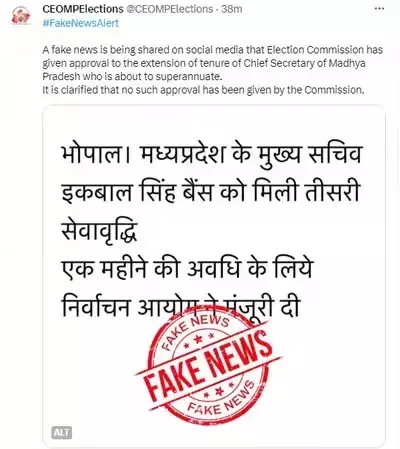 |भोपाल। मध्य प्रदेश के मुख्य सचिव इकबाल सिंह बैंस के एक्सटेंशन की अफवाह का चुनाव आयोग ने खंडन किया है। मुख्य निर्वाचन पदाधिकारी (सीईओ) अनुपम राजन ने गुरुवार को मुख्य सचिव का कार्यकाल एक महीने के लिए बढ़ाए जाने की खबर को अफवाह बताया है। उन्होंने कहा कि सोशल मीडिया पर फेक न्यूज वायरल हो रही है। चुनाव आयोग ने इस तरह का कोई अप्रूवल नहीं दिया है।