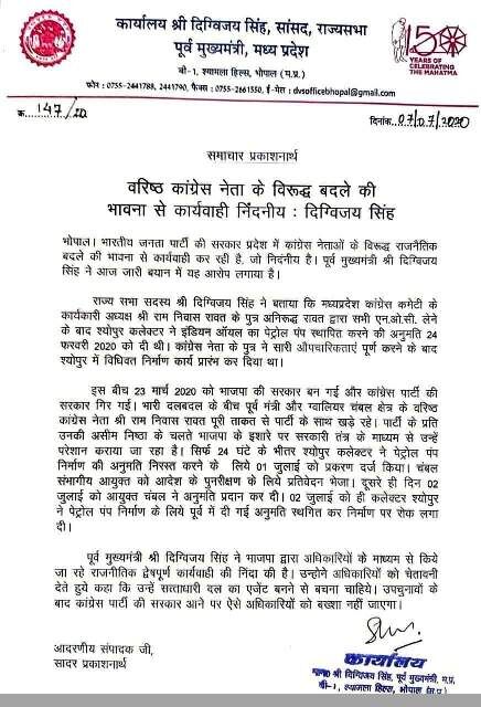 राज्यसभा सांसद दिग्विजय सिंह ने कहा है कि, 23 मार्च 2020 को भाजपा की सरकार बन गई और कांग्रेस पार्टी की सरकार गिर गई। भारी दलबदल के बीच पूर्व मंत्री और ग्वालियर चंबल क्षेत्र के वरिष्ठ कांग्रेस नेता राम निवास रावत पूरी ताकत से पार्टी के साथ खड़े रहे। पार्टी के प्रति उनकी असीम निष्ठा के चलते भाजपा के इशारे पर सरकारी तंत्र के माध्यम से उन्हें परेशान कराया जा रहा है। सिर्फ 24 घंटे के भीतर श्योपुर कलेक्टर ने पेट्रोल पंप निर्माण की अनुमति निरस्त करने के लिये 1 जुलाई को प्रकरण दर्ज किया। चंबल संभागीय आयुक्त को आदेश के पुनरीक्षण के लिये प्रतिवेदन भेजा। दूसरे ही दिन 2 जुलाई को आयुक्त चंबल ने अनुमति प्रदान कर दी। 2 जुलाई को ही कलेक्टर श्योपुर ने पेट्रोल पंप निर्माण के लिये पूर्व में दी गई अनुमति स्थगित कर निर्माण पर रोक लगा दी।