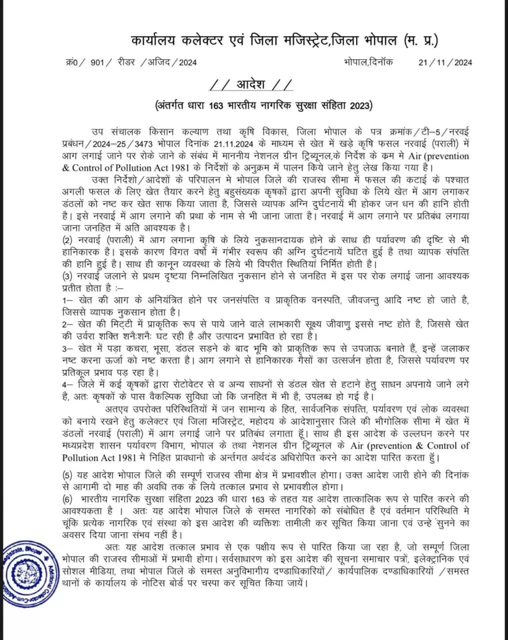 |Bhopal News : भोपाल, मध्यप्रदेश। राजधानी में पराली जलाने पर रोक लगा दी गई है। भोपाल कलेक्टर कौशलेंद्र विक्रम सिंह ने आदेश जारी कर 2 महीने के लिए प्रतिबंध लगाया है। इस आदेश का उल्लंघन करने पर FIR दर्ज की जाएगी। जारी आदेश भोपाल जिले की सम्पूर्ण राजस्व सीमा क्षेत्र में प्रभावशील होगा।
