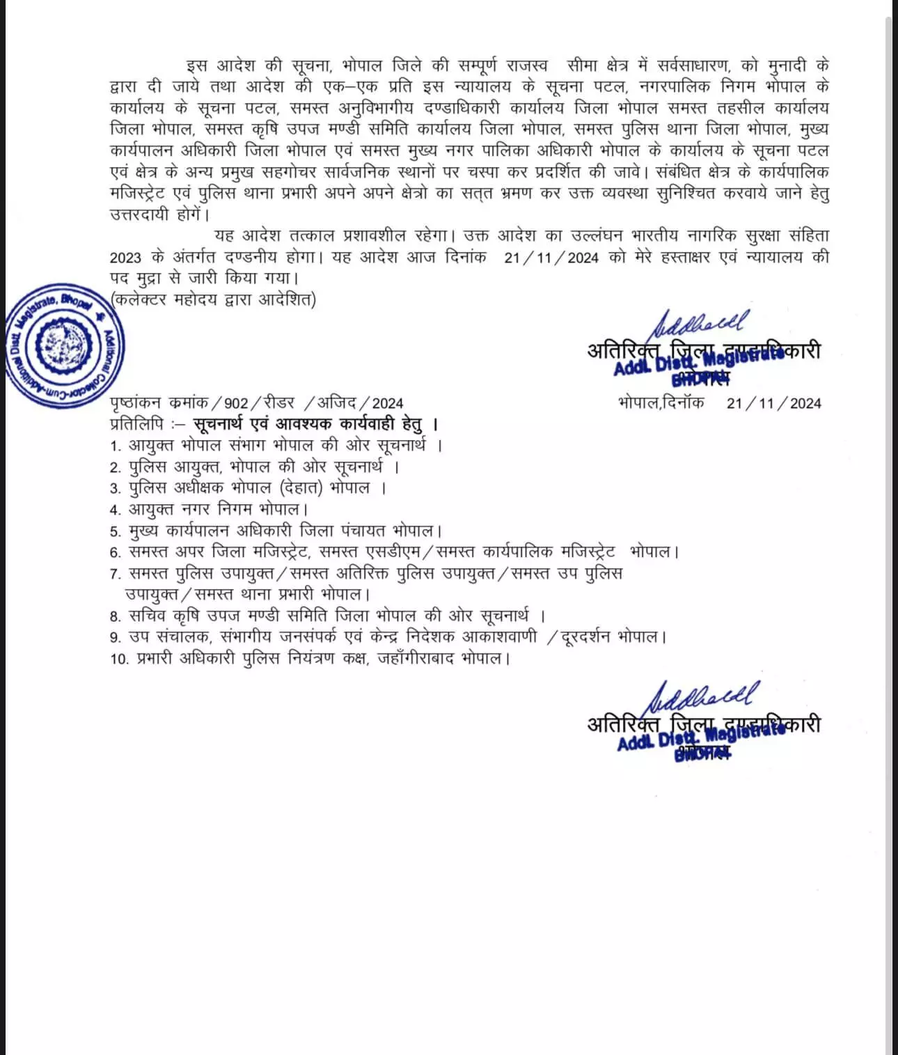 आदेश में कहा गया है कि, भोपाल जिले की राजस्व सीमा में फसल की कटाई के बाद अगली फसल के लिए खेत तैयार करने हेतु बहुसंख्यक कृषकों द्वारा अपनी सुविधा के लिये खेत में आग लगाकर डंठलों को नष्ट कर खेत साफ किया जाता है, जिससे व्यापक अग्नि दुर्घटनायें भी होकर जन - धन की हानि होती है। इसे नरवाई में आग लगाने की प्रथा के नाम से भी जाना जाता है। नरवाई में आग लगाने पर प्रतिबंध लगाया जाना जनहित में अति आवश्यक है।