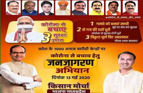 भोपाल। कोरोना संकट के बीच प्रदेश में भारतीय जनता पार्टी किसान मोर्चा जनजागरण अभियान शुरू करने जा रही है। किसान मोर्चा इस अभियान की शुरुआत 13 मई से करेगा। इस अभियान के तहत किसान मोर्चा भाजपा कार्यकर्त्ता कार्यकर्ता किसानों को कोरोना से बचाव की जानकारी देंगे।