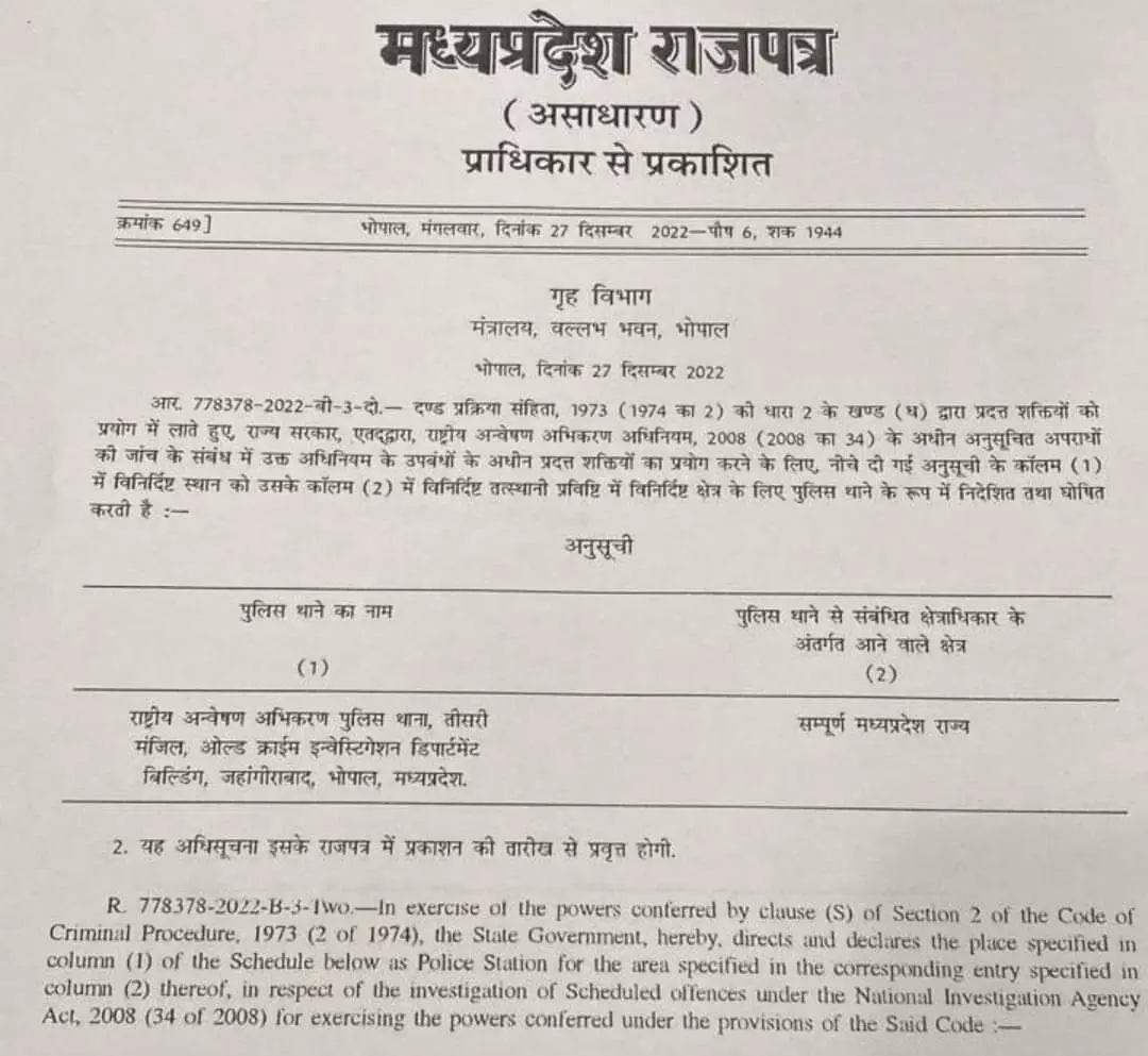 राज्य शासन ने भोपाल में एनआईए के पुलिस थाने के लिये अधिसूचना जारी कर दी है। एनआईए पुलिस थाना जहाँगीराबाद में ओल्ड क्राइम इन्वेस्टिगेशन डिपार्टमेंट की तीसरी मंजिल पर होगा। थाने का कार्यक्षेत्र सम्पूर्ण मध्यप्रदेश रहेगा।मध्यप्रदेश के गृह विभाग की अधिसूचना में कहा गया है कि इस थाने का नाम राष्ट्रीय अन्वेषण अभिकरण यानी राष्ट्रीय जांच एजेंसी पुलिस थाना होगा। केंद्र सरकार के गृह मंत्रालय के अधीन यह कार्य करेगा। इसमें रिक्त पदों पर नियुक्ति दिल्ली से ही होगी। अस्थायी रूप से यह थाना जहांगीराबाद में रहेगा। एनआईए को राज्य सरकार की ओर से जब जमीन मिल जाएगी, तब इसे अलग भवन मिल जाएगा।