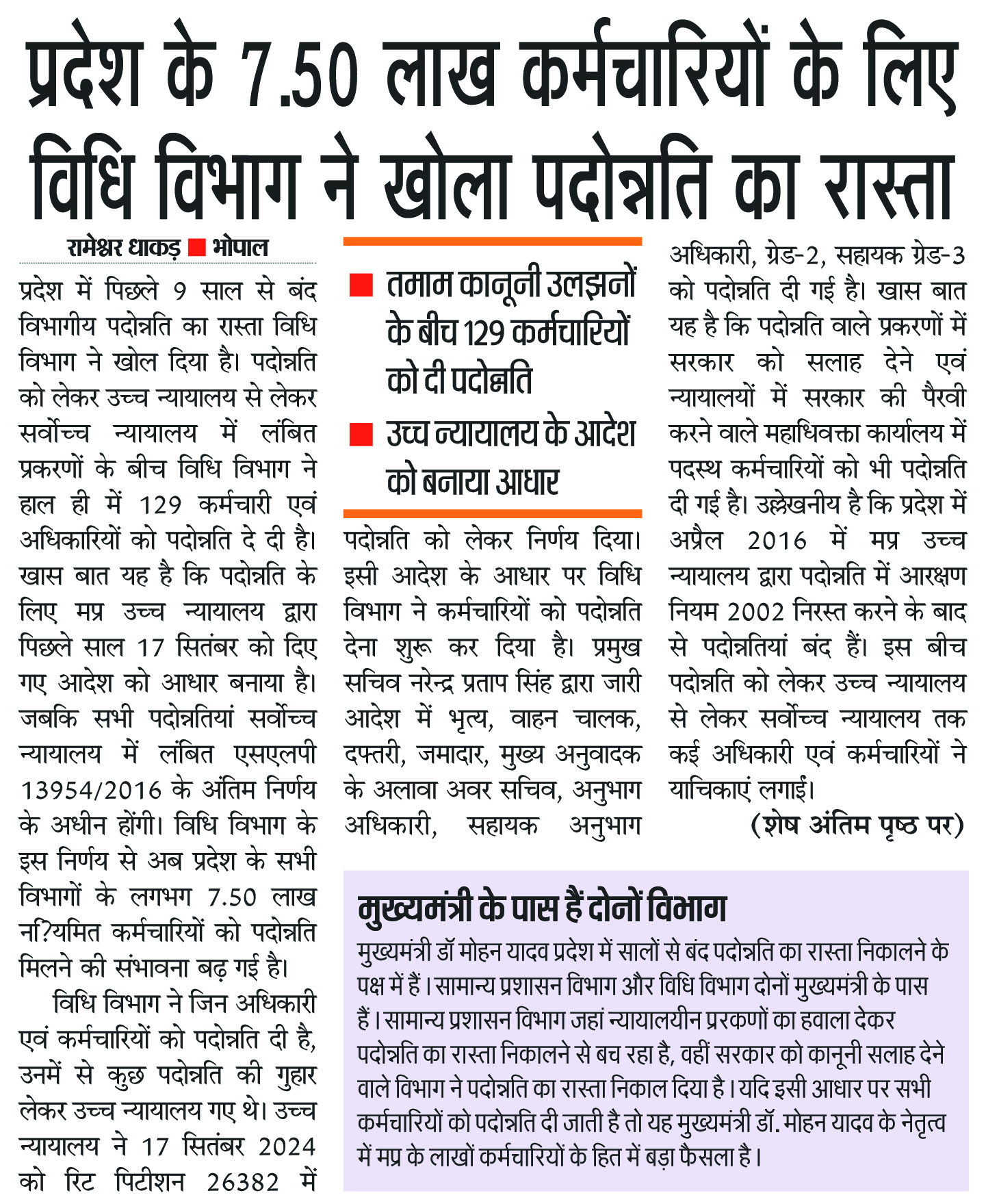 जबकि सभी पदोन्नतियां सर्वोच्च न्यायालय में लंबित एसएलपी 13954/2016 के अंतिम निर्णय के अधीन होंगी। विधि विभाग के इस आदेश के बाद सभी विभागों के अधिकारी, कर्मचारियों ने शासन से पदोन्नति की मांग की। मुख्यमंत्री डॉ. मोहन यादव ने भी पदोन्नति का रास्ता निकलवाने में विशेष रुचि दिखाई है।