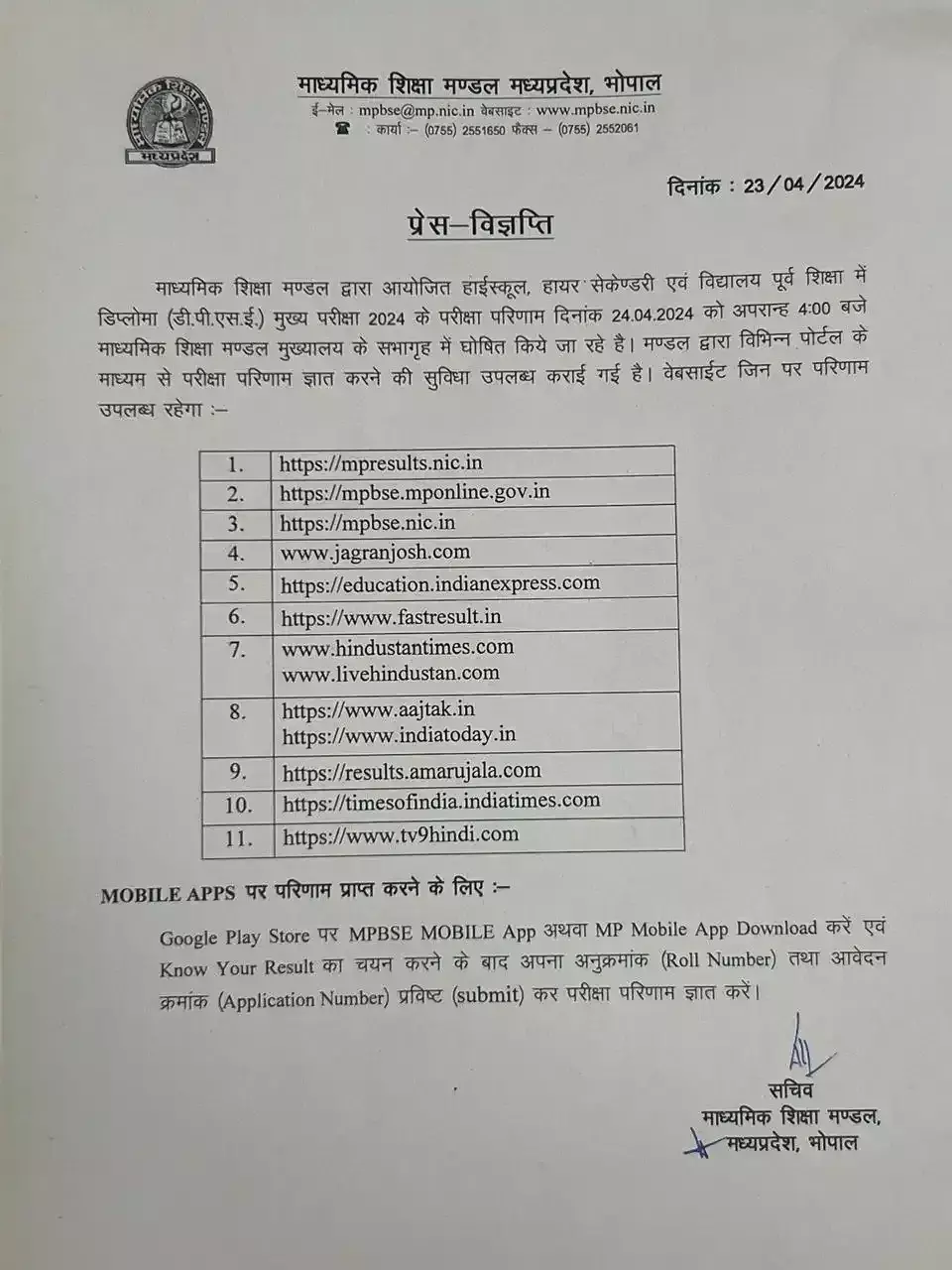 भोपाल। माध्यमिक शिक्षा मंडल बोर्ड ने 10वीं और 12वीं के रिजल्ट की घोषणा कर दी है। रिजल्ट 24 अप्रैल को शाम 4 बजे आएगा। बोर्ड पिछले डेढ़ महीने से लगातार रिजल्ट्स को लेकर तैयारियां कर रहा है।