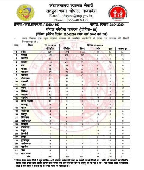 इस रिपोर्ट के अनुसार राजधानी भोपाल में 30 नए मामले सामने आये है। जिसके बाद संक्रमितों की संख्या बढ़कर 458 हो गई है। राजधानी में अब तक संक्रमण से 13 लोगों की मौत हो चुकी है और 139 लोग स्वस्थ होकर घर जा चुके है। हॉटस्पॉट बनकर उभरे इंदौर में 165 नए मरीजों के संक्रमित होने की पुष्टि हुई है। यहां अब तक महामारी से 63 लोगों की मौत हो चुकी है। जबकि 134 लोग स्वस्थ होकर घर जा चुके हैं। वहीँ उज्जैन जिले में 4 नए मरीज मिलने के बाद कोरोना संक्रमित मरीजों की संख्या 123 पहुंच गई है, जिसमें से 20 लोगों की मौत हो चुकी है।