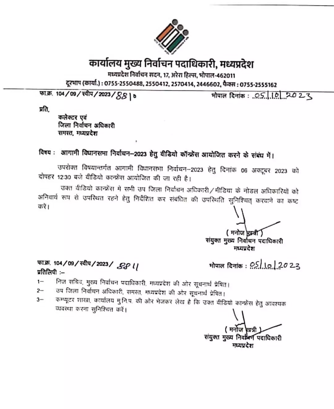|माना जा रहा है कि कल प्रदेश में आचार संहिता लागू हो सकती है।मप्र में प्रशासनिक स्तर पर विधानसभा चुनाव की तैयारियां तेजी से चल रही है। राजनीतिक दलों से लेकर आम जन तक सभी को अब चुनावों की तारीखों के ऐलान का इन्तजार है। इसी बीच कल शुक्रवार 6 अक्टूबर को निर्वाचन आयोग ने प्रेस वार्ता बुलाई है। जिसमें सभी निर्वाचन अधिकारी एवं मीडिया के नोडल अधिकारियों को अनिवार्य रूप से उपस्थित होने के दिए निर्देश।