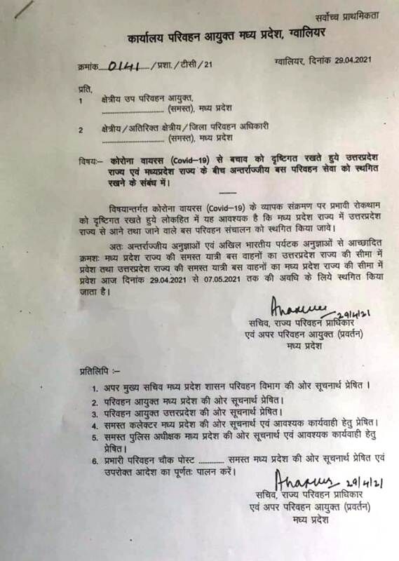 ग्वालियर/वेब डेस्क। प्रदेश के साथ पड़ोसी राज्य उप्र में जारी कोरोना संकट को देखते मध्य प्रदेश परिवहन विभाग ने दोनों राज्यों के बीच बसों के संचालन रोक लगा दी है। ये आदेश आगामी 7 मई तक लागू रहेगा। वर्तमान में उत्तर प्रदेश में कोरोना संक्रमण का प्रसार तेजी से बढ़ता जा रहा है। यही वहां पंचायत चुनाव जारी है