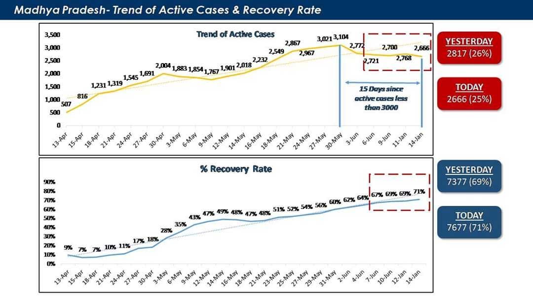 मुख्यमंत्री चौहान ने कहा कि रिकवरी रेट में मध्यप्रदेश भारत में दूसरे स्थान पर है। म.प्र. की रिकवरी रेट 71.1 प्रतिशत हो गई है, जबकि भारत की 50.6 प्रतिशत है। राजस्थान की सर्वाधिक 75.3 प्रतिशत है। गुजरात की 68.9, उत्तरप्रदेश की 60 तथा तमिलनाडु की 54.8 प्रतिशत है।