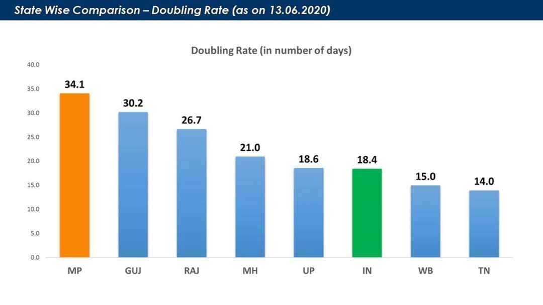 मुख्यमंत्री ने कहा कि कोरोना संक्रमण की पूरे देश में मध्यप्रदेश में सबसे धीमी गति है। हमारी डबलिंग रेट 34.1 दिन है, जबकि भारत की 18.4 दिन है। गुजरात की 30.2 दिन, राजस्थान की 26.7 दिन, महाराष्ट्र की 21 दिन तथा उत्तरप्रदेश की 18.6 दिन है।
